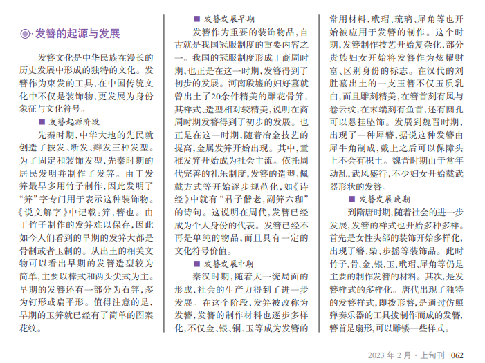 簪是古人用来插定发髻、 连冠于发的长针。男子的簪, 更朴素实用;女子的簪,兼具实 用与美饰。钗,是簪的变式,是 由两股簪子交叉组合而成的首 饰。簪、钗的发展与演变贯穿 了中国古代的数千年历史,通 过对它们的追寻,能感受到华 夏文明的独特内涵。戴金翠之 首饰,缀明珠以耀躯。小巧玲 珑的簪、钗,整日与古人贴身相 伴,凝聚了一代又一代人的高 妙技艺,展现了中华民族深厚 的文化底蕴。