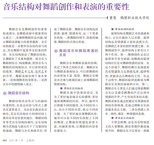随着人们对舞蹈艺术的鉴 赏能力的提高,舞蹈创作与音乐 结构的关系也日益复杂化。舞蹈 创作中的情感、思想都要用音乐 来传达,而身体语言则可以使观 众在情绪上与舞蹈、音乐产生共 鸣。舞蹈创作是实现音乐结构内 在化的重要媒介,二者是相互依 存、相互联系的。舞蹈的音乐结 构和舞蹈表演之间存在着密切的 联系,深入理解舞蹈的音乐结构, 并将两者之间的联系发挥到极 致,才能让舞蹈更生动,从而有效 地提升舞蹈的观赏效果。