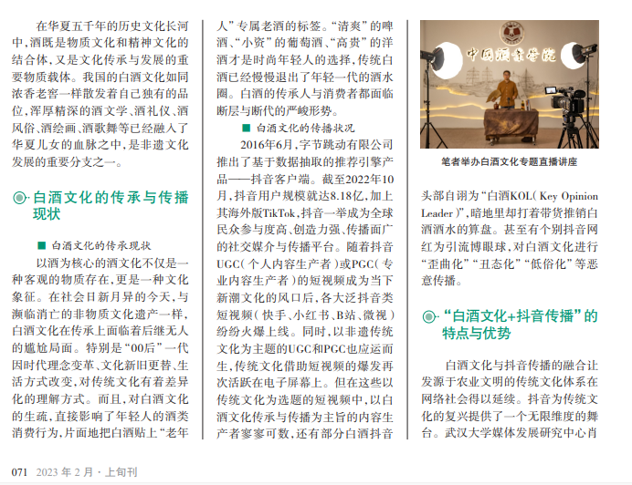 中国白酒文化底蕴深厚,在 互联网时代探索白酒文化的传 承与传播方式,是当代中国文化 语境的突破。“白酒文化+抖音传 播”的跨界演绎,让日渐式微的白 酒文化以全新“数码化”的动态 影像形式再呈现和再诠释。无处 不在的抖音短视频传播平台,再 次唤醒国粹文化原有的生命力, 让白酒文化与现代潮流文化共同 繁荣。抖音的传播复活了大众逐 渐模糊的中国文化记忆,特别是 激活了青年一代对传统文化的认 同感,增强了国人的“文化自信”。