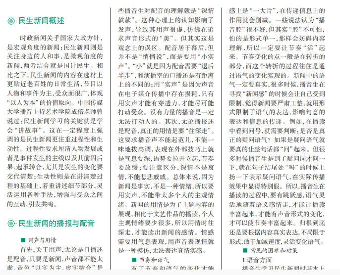 民生新闻的学习是继时政新闻之后播音生在新闻方向的另一门主要课程。如果说时政新闻的主要 特点是“正”,那民生新闻的主要特点就是“活”。相比时政新闻聚焦国家大政方针以及国际政治大事件, 民生新闻关注的是与老百姓息息相关的事件。