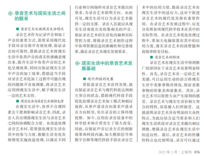录音艺术是指将自然界或 者社会中满足人们某种需求的 声音记录下来,形成一种独特的 艺术形式,为各个行业声音传播 和信息传输的顺利开展提供便 利支持。结合多方面分析研究 发现,录音艺术与现实生活之间 存在紧密联系。因此,录音人员 应根据行业发展特征和社会需 求对录音实施艺术化处理,提升 录音艺术在各行业中的发展空 间和实际管控效果,将录音艺术 在现实生活中的应用价值提升 到一定高度。