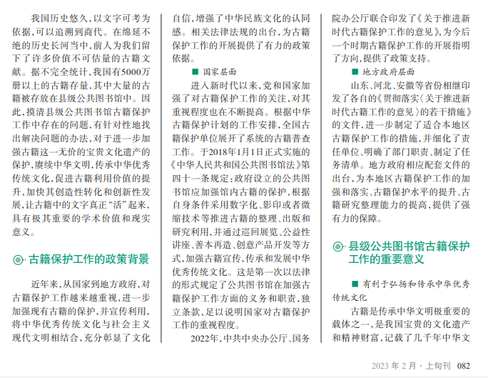 近年来,古籍保护工 作越来越受重视,国家、 地方都出台了相应的政 策法规加强古籍保护工 作,藏有大量古籍的县级 公共图书馆迎来了机遇 和挑战。本文阐述新时 期古籍保护工作的政策 背景,分析研究县级公共 图书馆古籍保护工作的 重要意义和遇到的困难, 并就相应问题的解决和 宣传利用提出了建议和 措施。