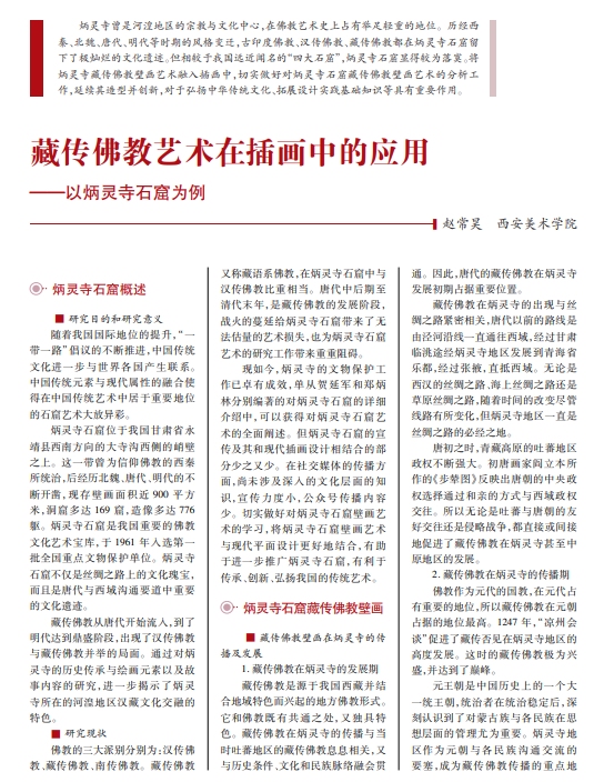 炳灵寺曾是河湟地区的宗教与文化中心,在佛教艺术史上占有举足轻重的地位。历经西 秦、北魏、唐代、明代等时期的风格变迁,古印度佛教、汉传佛教、藏传佛教都在炳灵寺石窟留 下了极灿烂的文化遗迹。但相较于我国远近闻名的“四大石窟”,炳灵寺石窟显得较为落寞。将 炳灵寺藏传佛教壁画艺术融入插画中,切实做好对炳灵寺石窟藏传佛教壁画艺术的分析工 作,延续其造型并创新,对于弘扬中华传统文化、拓展设计实践基础知识等具有重要作用。