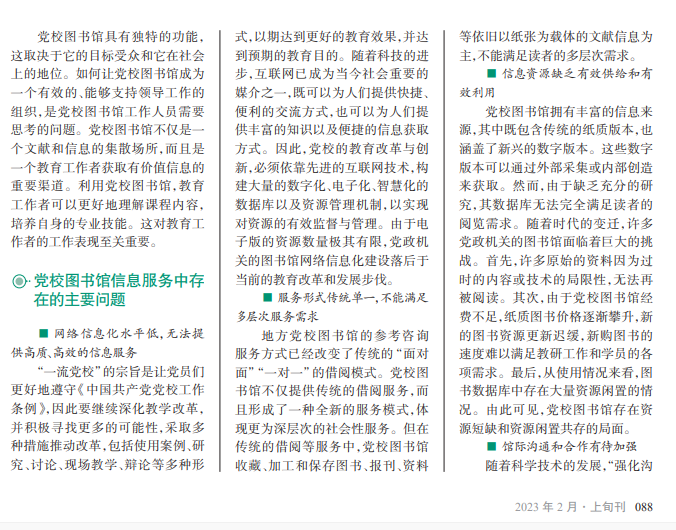 党校图书馆具有独特的功能, 这取决于它的目标受众和它在社会 上的地位。如何让党校图书馆成为 一个有效的、能够支持领导工作的 组织,是党校图书馆工作人员需要 思考的问题。党校图书馆不仅是一 个文献和信息的集散场所,而且是 一个教育工作者获取有价值信息的 重要渠道。利用党校图书馆,教育 工作者可以更好地理解课程内容, 培养自身的专业技能。这对教育工 作者的工作表现至关重要。