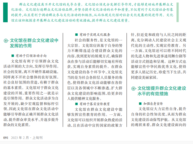 群众文化建设离不开文化馆的先导力量。文化馆必须充分发挥引导作用,才能够更好地开展群众文 化活动。文化馆打造群众文化活动品牌,并努力提升文化活动的水平和质量,不仅有利于文化馆社会形象 的提升,而且有利于调动群众参与文化活动的积极性,从而体现文化馆对社会文化发展的促进作用。文化 馆应该积极探索开展群众文化建设活动的有效措施,提升群众文化建设质量。